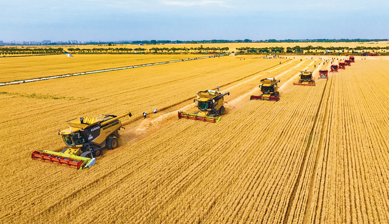 2024年,我国粮食出产迈上新台阶,初次冲破1。4万亿斤,农业分析出产能力不竭提拔,国度粮食平安根底日益夯实。图为2024年5月29日,正在河南省驻马店市西平县老王坡高尺度农田,机收编队正在收成小麦。 发 赵永涛/摄。