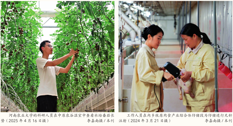 正在保障粮食平安的前提下,河南不竭提高农业质量效益和合作力,努力实现粮食平安和现代高效农业相同一。河南现代高效农业正派历从机械化到数字化、从经验驱动到数据驱动的底子性改变。正在内乡县的牧原肉食财产分析体,21栋养猪大楼林立,这里每年出栏生猪210万头。智能巡检机械人是每栋楼里“最靓的仔”,它能够24小时不间断地收集温度、湿度、猪群体征、猪群非常声音等14项目标,并及时传送到云平台,及时预警,推送处理方案。“哪怕有猪呈现咳嗽,巡检机械人也会亮起灯,提示豢养员查看。”牧原集团智能化使用担任人胡义怯说。智能环控、智能饲喂等系统让猪住得舒服、吃得健康。“2011年,公司起头消息化摸索,2019年成立了专业智能化团队,通过云、大数据阐发和从动化设备运转,实现对生猪养殖的聪慧办理。”胡义怯说。据悉,牧原集团2024年出栏生猪7160万头,满脚超1亿人的猪肉需求,间接创制14万个就业岗亭。近年来,河南通过培育新品种、改善设备配备、引进集约化养殖手艺等手段不竭加强畜牧业供应保障能力和市场所作力。加速畜牧业种业复兴。先后培育出夏南牛、豫南黑猪、黄淮肉羊、豫粉1号蛋鸡等畜禽新品种(系)。加快畜牧业工业化、设备化。目前全省年出栏5万头以上生猪养殖场中,从动化饮水已实现全笼盖,全程机械化饲喂率达97%;百头以上奶牛场中,90%以上配备了喷淋、电扇等降温设备设备,82%实现了全程机械化饲喂;50万只以上肉禽场和10万只以上蛋禽场中,90%实现了全程机械化饲喂,88%实现了从动化节制。鞭策高效集约化养殖,进行数智化办理。全省100%的根本母猪、95%的母牛采用人工授精配种手艺,规模奶牛场精准饲喂手艺普及率达90%以上。畜牧业出产效率大幅提高。2023年,全省参测奶牛单产提拔至9。7吨,较2019年提高1吨。牧原公司位于南阳市内乡县的6层全智能化生猪养殖,1名豢养员年可豢养商品猪1万头,取保守养殖场比拟,单元地盘产出率提高了4。3倍,劳动出产率提高了5倍以上。2024年,河南省肉蛋奶总产量1337万吨,全年实现畜牧业产值2610亿元,同比增加1。8%,为丰硕国平易近餐桌做出了主要贡献。正在信阳市潢川县“将来农场”,楼顶的玻璃温室里,无土栽培的彩色西红柿挂满枝头,西红柿的藤蔓沿着绳子能爬三米高,一茬接一茬地出产西红柿,整个采摘季跨越六个月,亩产远远高于保守农业种植。“将来农场”场长张祺恺告诉记者,农场采用无土栽培,温度、湿度、二氧化碳浓度、水肥等都是智能节制的。正在这栋建建的一楼,“将来农场”数字化从管闫李明正通过电脑节制着能源、环控、水肥、通风等系统。“电脑上能看到农场表里3000多个点位的数据,包罗西红柿发展的养分基质的温度、湿度、酸碱度,我们还会适量向农场内弥补二氧化碳,以提高光合感化效率。”闫李明说。目前,河南省设备蔬菜根基构成了豫南地域塑料大棚为从的初春和晚秋菜,豫北日光温室为从的冬春菜,豫东、豫中地域温室取大棚并沉的冬春和早秋菜。2025年,设备蔬菜面积将提高10%以上,确保“菜篮子”产物愈加丰盈。正在通许县酸辣粉财产园,从动化流水线快速运转,红薯淀粉颠末20多道工序后,变身为一桶桶酸辣爽口、甘旨健康的酸辣粉……每天200多万桶酸辣粉从这里人们的餐桌。通许县酸辣粉财产成长专班担任人李振举告诉记者,截至目前,酸辣粉相关出产线万人次,已建成全国最大的酸辣粉出产加工。河南借帮“豫农优品”公共品牌,通过基金投资、供应链办事、项目合做、财产共建等体例支撑特色农产物做强做优,提拔品牌价值。河南农业投资集团操纵具有基金、安全、农业供应链办事等投融资全功能劣势,深化产融连系,投资了漯河绿色食物、原阳预制菜、通许酸辣粉、杞县大蒜、西峡喷鼻菇、正阳花生、三门峡果业、南阳艾草等,搀扶处所特色劣势农业做强做优做大,下一步将通过打制“+企业+金融”共赢生态,鞭策“豫农优品”品牌影响力进入全国第一梯队。河南鞭策建立联农带农益农长效机制,财产帮扶到乡到村到户,把农业财产链的增值收益、就业岗亭尽量留给农人,让农人群众正在口有活干、有钱挣。全省农村居平易近人均可安排收入21330元,同比增加6。4%。