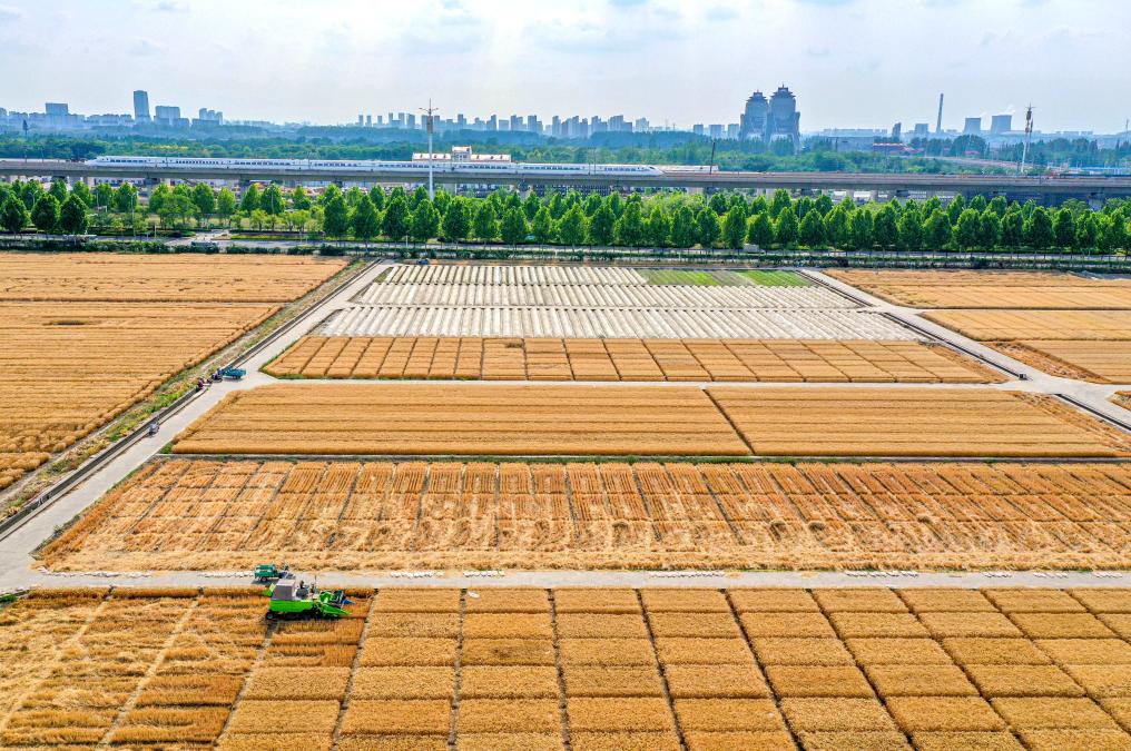 5月20日,正在江苏里下河地域农科所(扬州市农科院)试验田,农人驾驶收割机收割小麦(无人机照片)。发(任飞摄)。