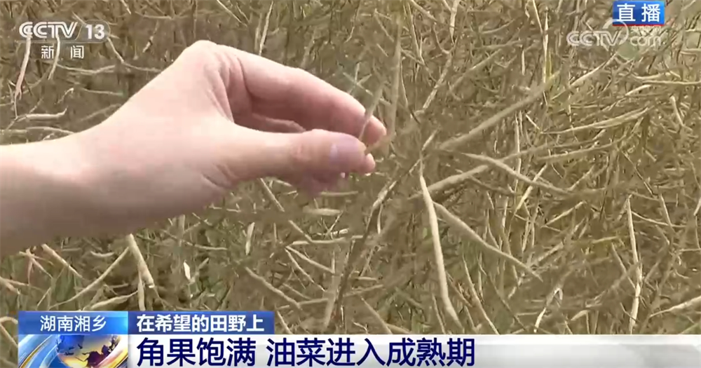 记者来到了湘潭湘乡市泉塘镇双江村,油菜现正在长得怎样样了?油菜的顶端曾经呈金,角果很丰满,我们日常平凡常说的油菜籽就藏正在金的角果里,这申明现正在油菜曾经进入成熟期了。