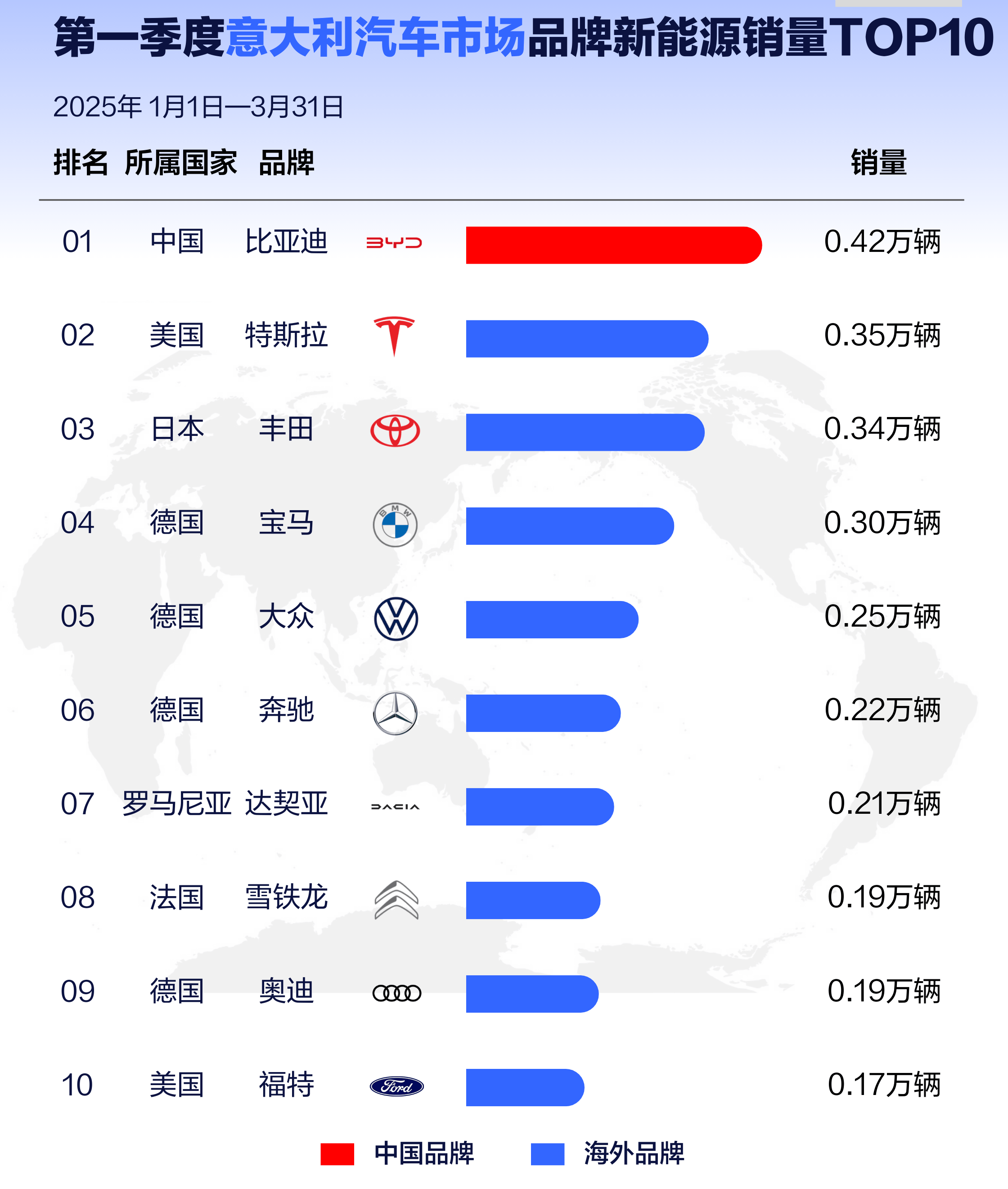 比亚迪的全球化计谋,成立正在敌手艺立异的持续深耕之上。自2003年进军汽车财产以来,这家企业用二十余年时间完成了从电池制制商到比亚迪全球销量冠军的。截至2025年第一季度,比亚迪全球累计销量冲破100。08万辆,同比增幅达59。81%,此中新能源车型占比持续攀升至98。6%。从2023年6月进入意富翁通场至今,比亚迪已于意大利全国设立多店,结构于米兰、都灵、佛罗伦萨等城市。目前比亚迪正在该国发卖车型包罗元PLUS、汉、海豚、海豹等。 2025年一季度,比亚迪凭仗0。42万销量佳绩荣膺该国新能源汽车销冠。 比亚迪旗下高端品牌腾势,正在本年4月的米兰设想周期间官宣进入欧洲,将进一步打开欧洲市场。